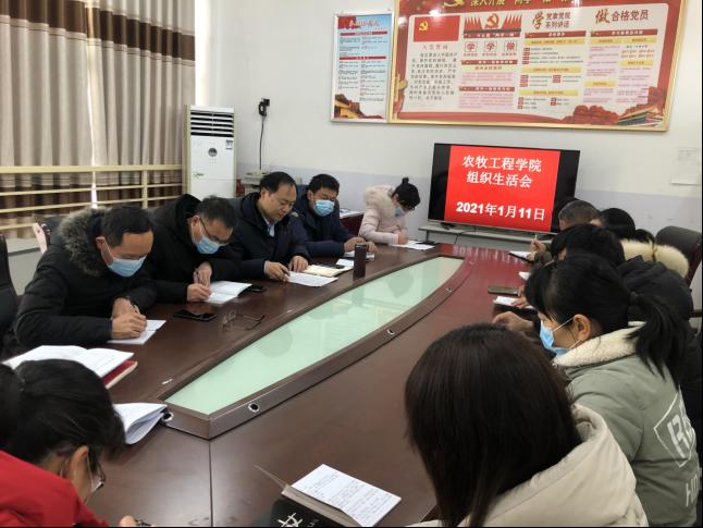 2021年1月11日上午,农牧工程学院党支部在党员活动室召开“深入贯彻学习习近平新时代中国特色社会主义思想,以党建工作为统领,促进学院工作高质量发展”专题组织生活会,开展批评与自我批评,查问题、找不足,全体党员进行政治“年检”。会议由党总支书记李民主持,支部全体党员参加会议。