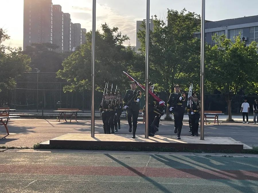 伴随着庄严的国歌,旗手扬起手中的五星红旗,鲜红的国旗冉冉升起,全体师生肃立,目光如炬。