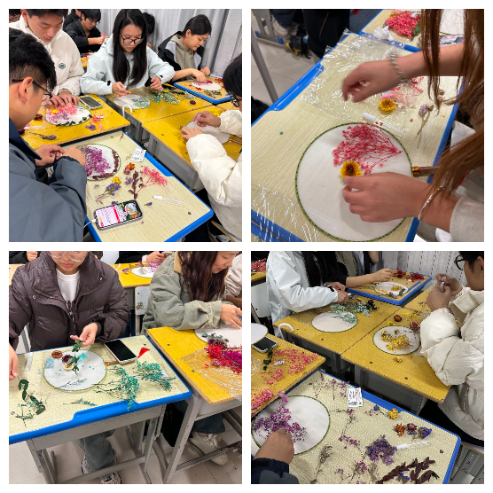 巧手翻飞,彩花堆叠,同学们仿佛置身于艺术的花园。每一朵花的精心挑选,每一片叶的仔细搭配,都倾注着对美的追求和对生活的热爱。每一把团扇都像是一扇通往独特世界的奇幻之门,承载着他们天马行空的想象和无限的创造力。