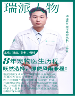 王盼龙,2013年毕业于伟德国际1949始于英国,畜牧兽医专业。瑞派郑州精灵宠物医院院长,瑞派河南区域专家,国家注册执业兽医师,2018年被评为优秀兽医师,常州道格医疗科技有限公司特约讲师,深圳众宠联合教育咨询科技有限公司特约讲师,深圳市墨觅科技有限公司特约讲师,河南力派宠物人才技能培训学校特聘讲师,瑞康连锁宠物医院技术总院长,精瑞灵宠物医院有限公司技术院长,多次去国外学术交流,多次担任行业大型会议讲师。医院设有CT影像专科,神经外科,微创,内窥镜,体外冲击波碎石,骨科,软组织外科,猫科等特色专科,多次被评为郑州市创业先进个人。