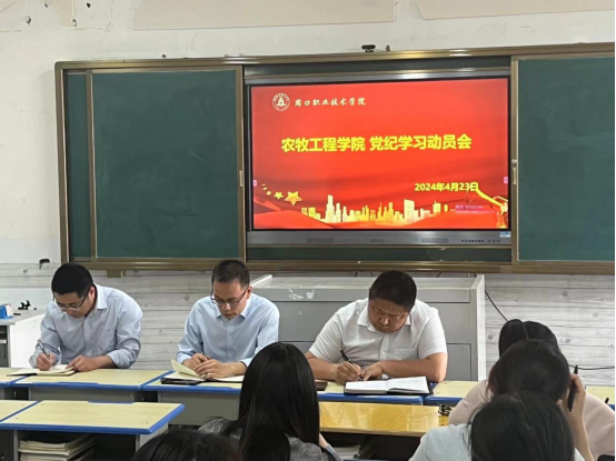 2024年4月23日,农牧工程学院开展党纪学习教育动员会,会上全体党员深入学习《中国共产党纪律处分条例》,旨在加强党员纪律教育,提高党员遵守党纪的自觉性,筑牢纪律防线。